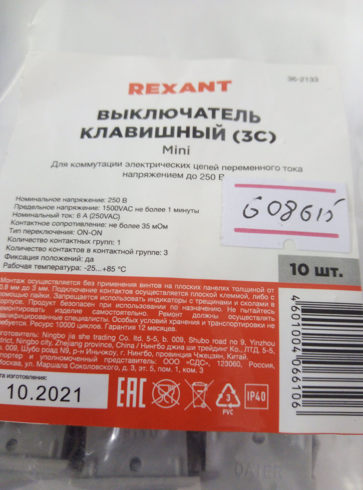 Rexant выключатель клавишный 250V 6А (3с) ON-ON серый Mini (RWB-202, SC-768)