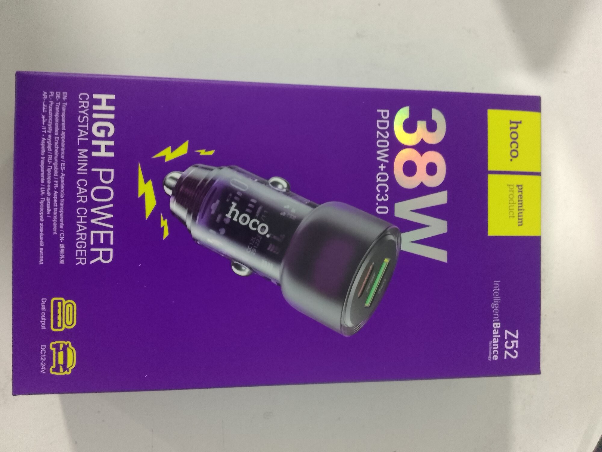 Автомобильное зарядное устройство 1 USB, 1 Type-C HOCO Z52 Spacious, 3000mA, пластик, QC3.0, PD38Вт, цвет: фиолетовый