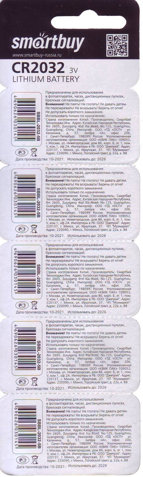 Батарейка CR2032 SmartBuy блистер. (Цена за 5шт)