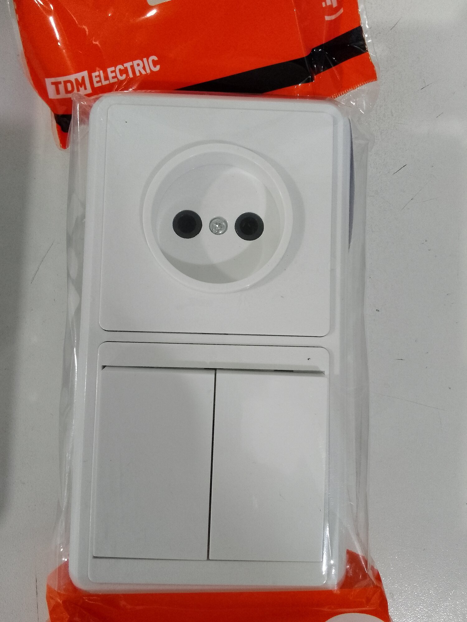 Блок комбинированный БКВР 2-х клавишный выключатель + розетка без земли с защитными шторками TDM, 220В, белый