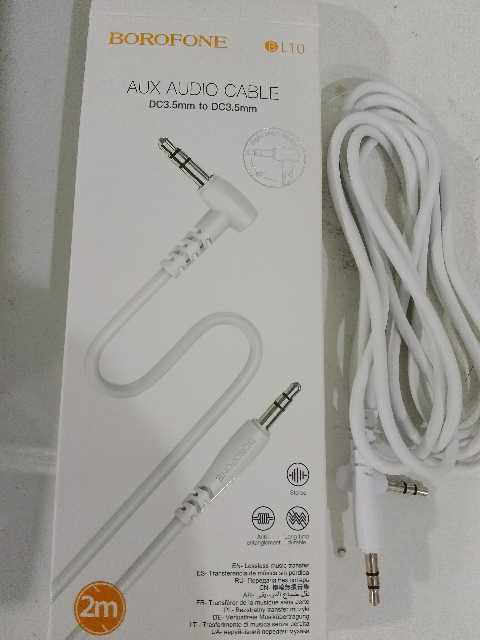 Кабель AUX, Jack 3,5mm(m) - Jack 3,5mm(m) Borofone BL10, 2м, круглый, боковой белый .