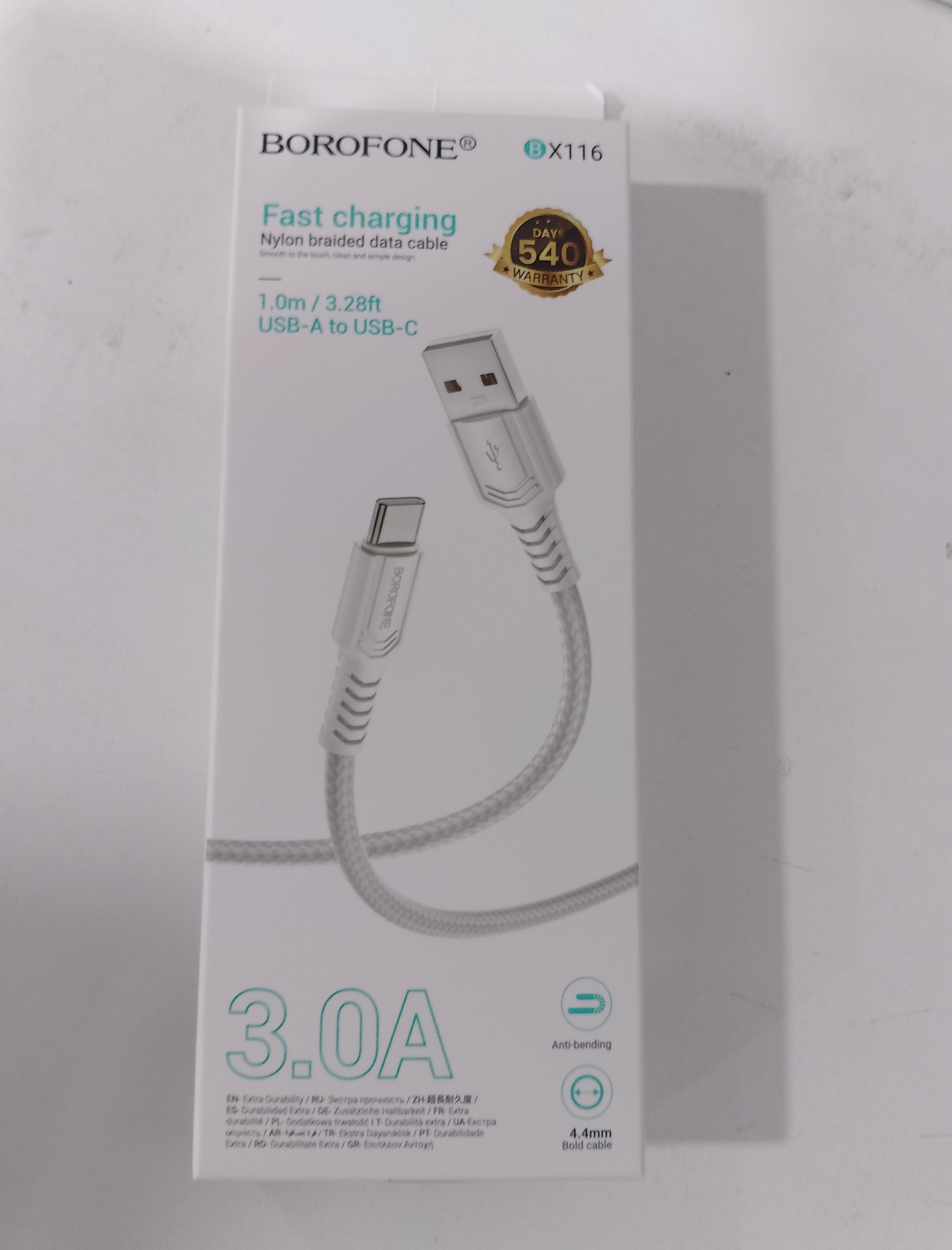 Кабель Type-C BOROFONE BX116 1м 3А, нейлон белый (коробка)