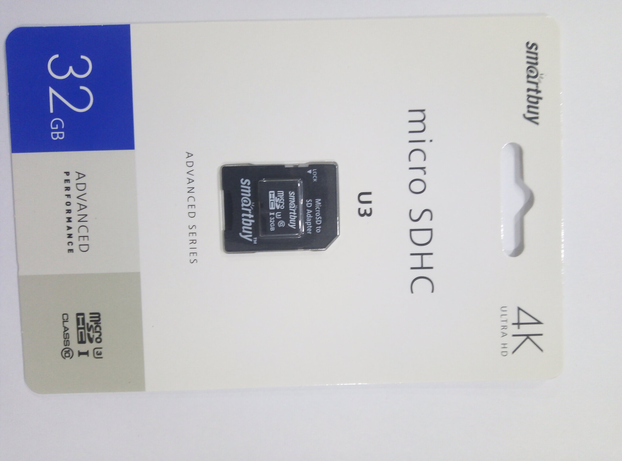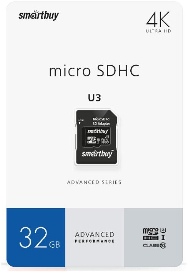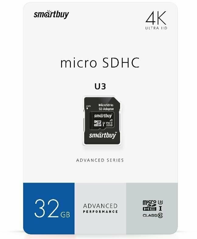 Карта памяти microSDHC Smart Buy 32Gb Class10 Advanced U3 V30 A1 (55/90 Mb/s)+SD адаптер