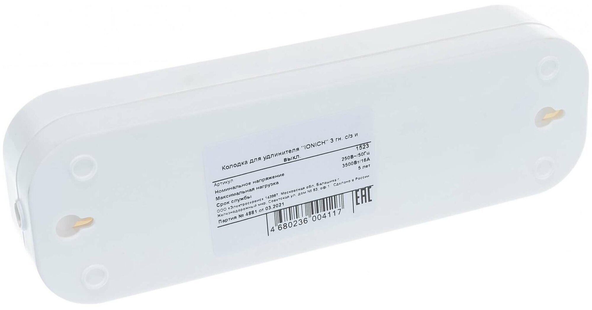 Колодка сетевая для удлинителя 3 гнезда с землей и выключателем 16А 250В "IONICH" белая