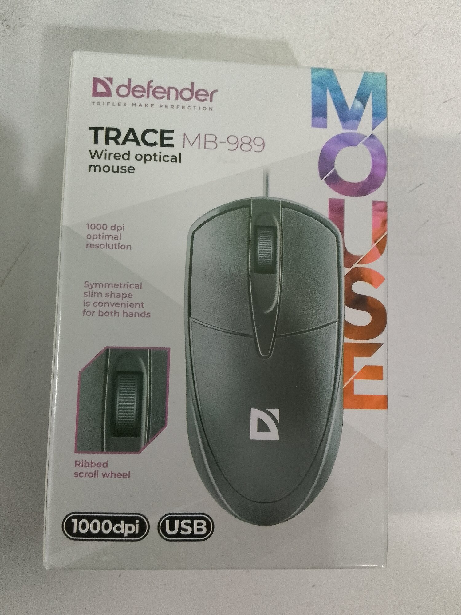 Мышь проводная DEFENDER Trace MB-989 черная, 1000dpi , Количество кнопок: 2 + колесо-кнопка, Тип сенсора: оптический, Длина кабеля: 1,2м.