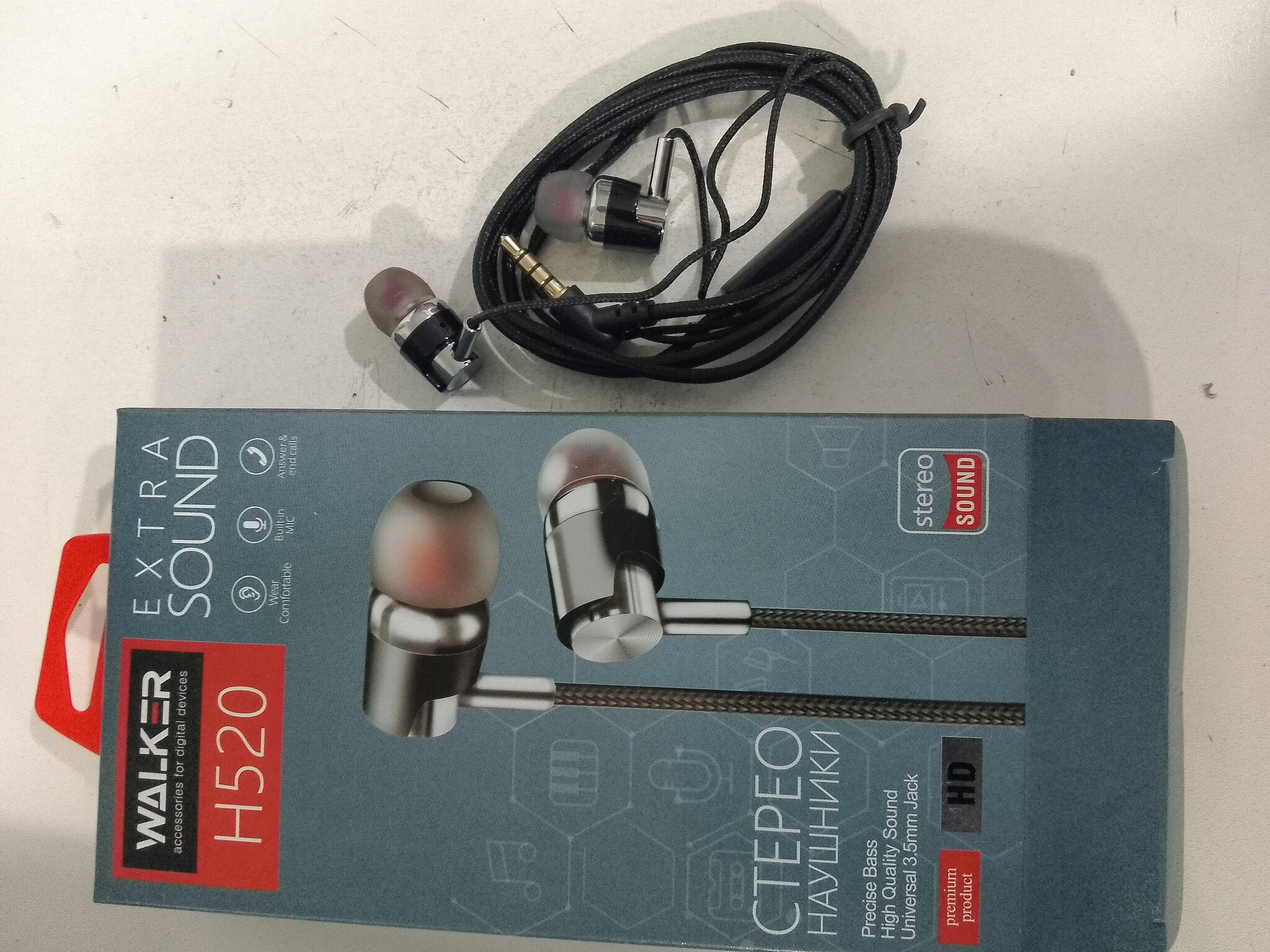 Наушники с микрофоном внутриканальные WALKER H520 с угловым штекером, тканевые