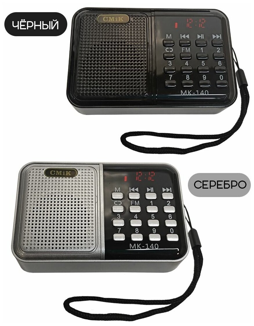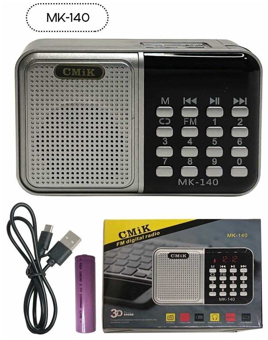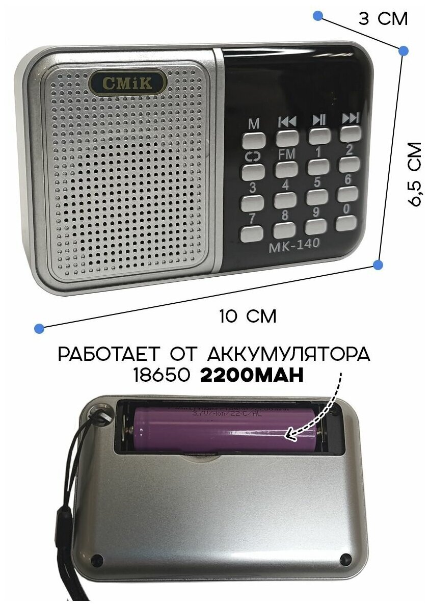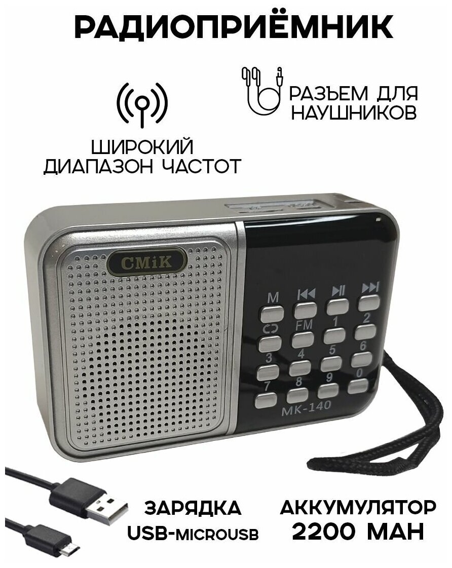 Радиоприемник беспроводной цифровой карманный CMIK MK-140 USB с FM-радио и MP3-проигрывателем, цвет радио серебристый.