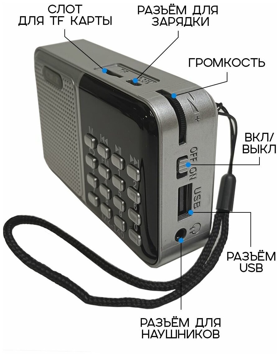 Функции Bluetooth блютуз и записи голоса как диктофон у данной модели радио нет. Само радио звучит громко и качественно, несмотря на компактный размер прибора. Мощность динамика 3W. Есть гнездо для подключения наушников, разъем 3,5 мм mini-jack. У радиоприемника есть USB-разъем для подключения флэшки, а также TF-слот для микро SD-карты в формате MP3.