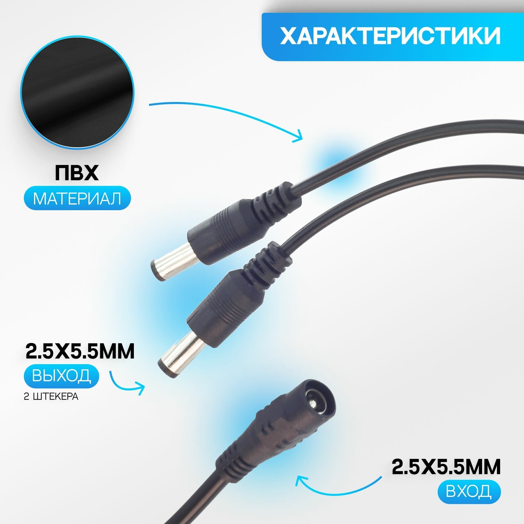 Разветвитель питания оснащен двумя выходными штекерами DC (2.5x5.5 мм), что позволяет подключить две камеры видеонаблюдения одновременно.Прочный и надежный материал