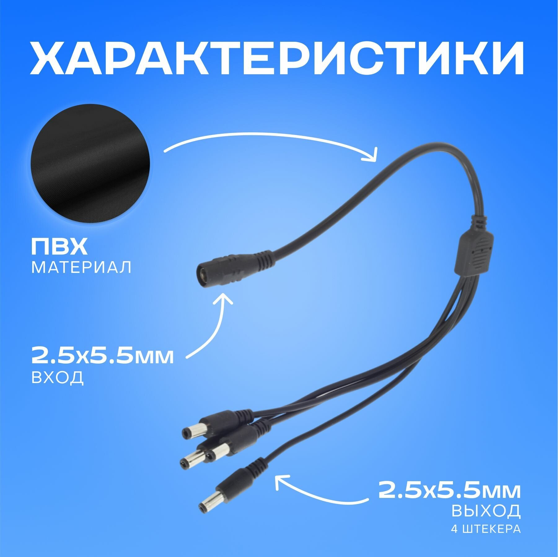 Разветвитель адаптера питания используется для подачи питания на несколько устройств, что устраняет необходимость в 4 источниках питания с одинаковой полярностью. Сердечник кабеля питания представляет собой провод из чистой меди и подходит для камер наблюдения, модемов, светильников, светодиодных лент и других приборов с разъемом 5,5мм. Перед подключением убедитесь, что у вашего основного источника питания достаточно силы тока (Ампер) для питания подключаемых приборов.