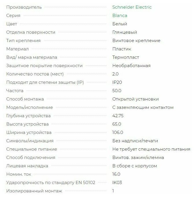 Розетка двухместная скрытой установки BLANCA 16А IP20 250В с заземлением белая SCHNEIDER ELECTRIC