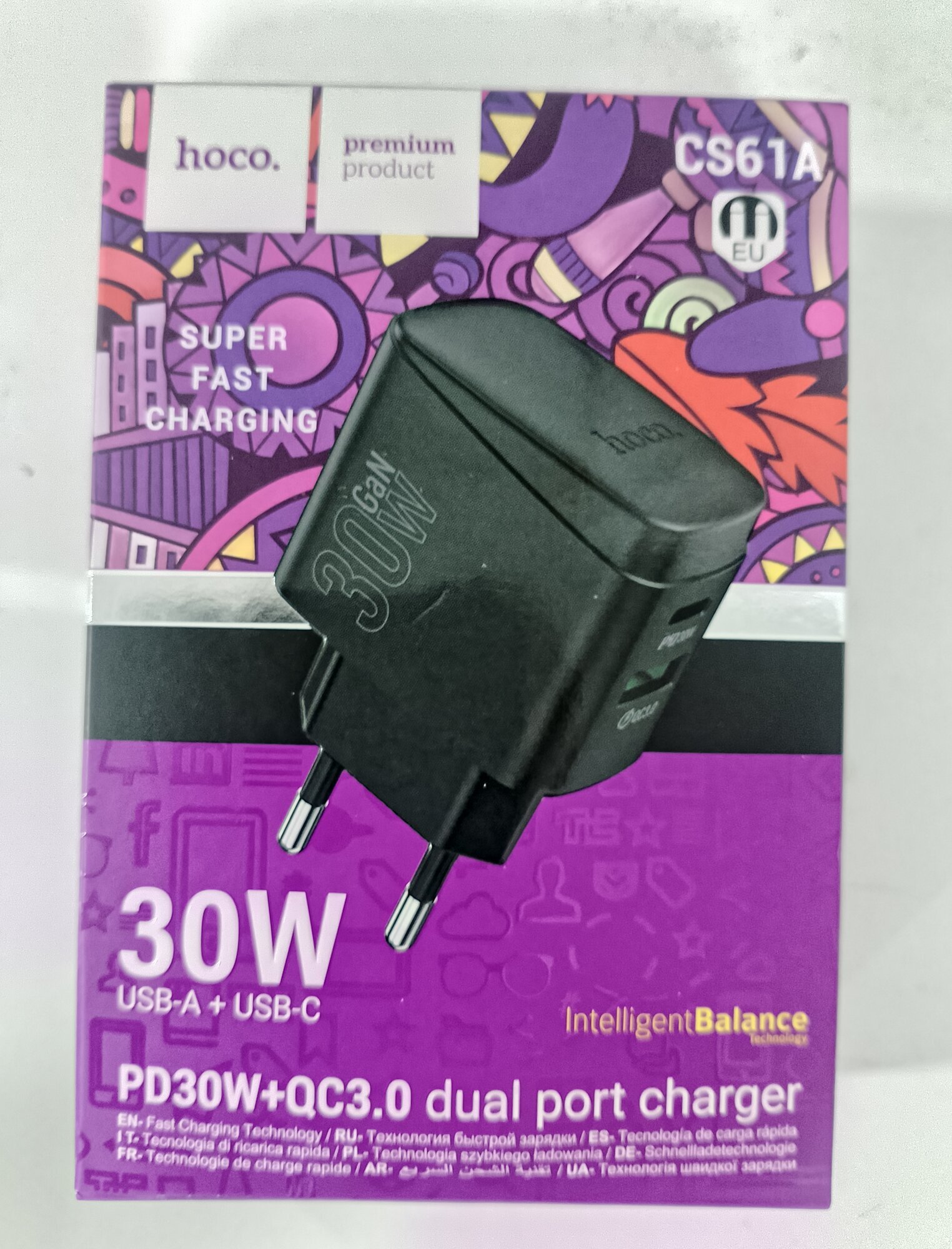 Сетевое зарядное устройство 1 USB, 1 Type-C HOCO CS61A Bright, 3.0A, PD30Вт, цвет: чёрный
