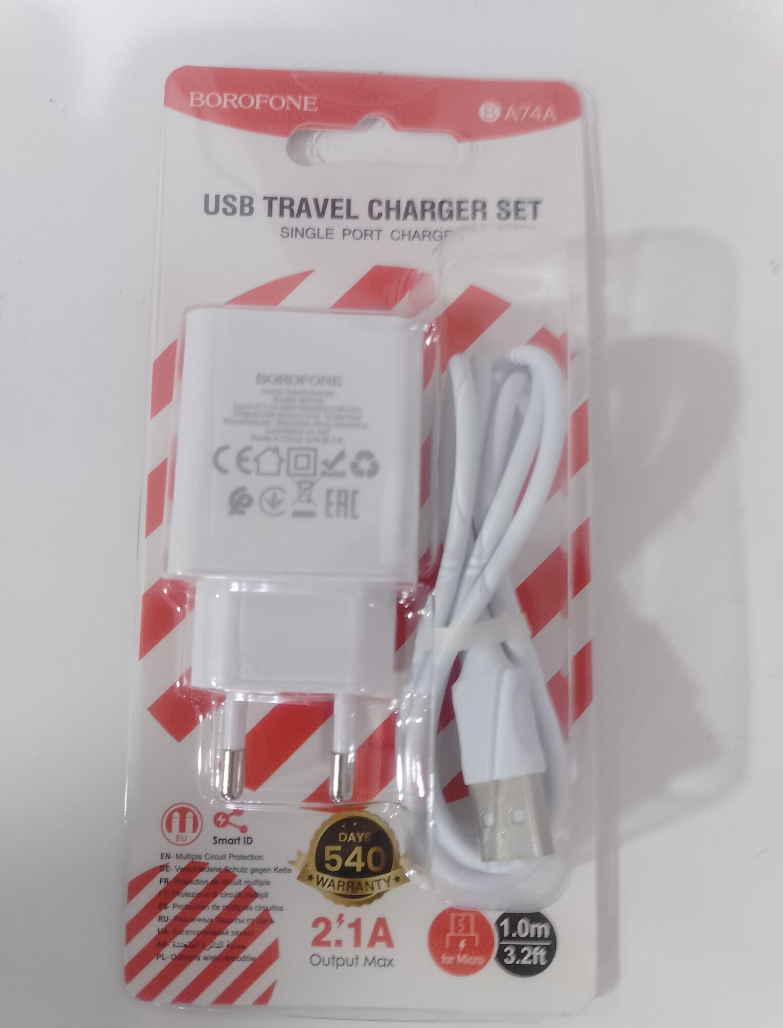 Сетевое зарядное устройство 1 USB Borofone BA74A Aspirer, пластик, 2.1A, кабель микро USB, цвет: белый