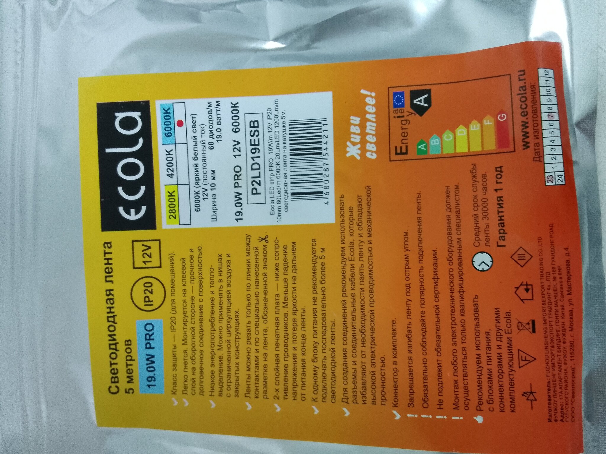 Лента светодиодная, 19Вт, 60 диодов на метр, 12V, IP20, 10mm, 1200Lm/m, 6000к холодный (белый) цвет, комплект 5м.