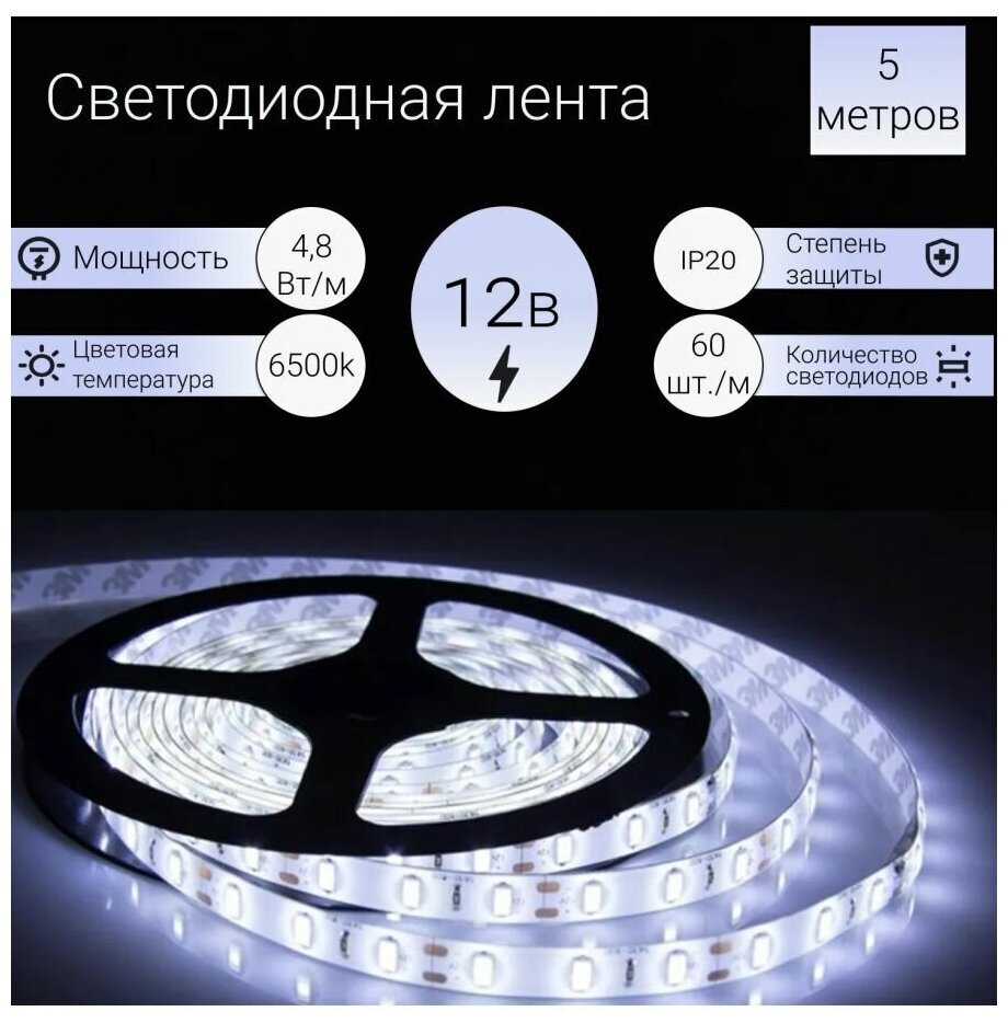 Светодиодная лента GLS 2835 - 60 - 4.8w-12v - IP20 - 6500 (холодный белый цвет) (5м) представляет собой высококачественное и функциональное осветительное решение для различных задач.
