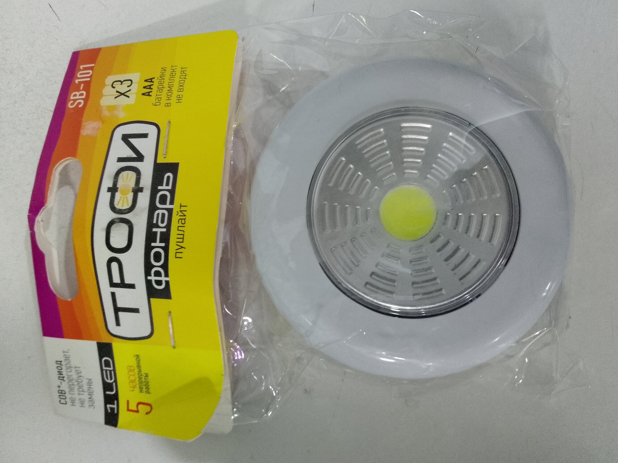 Светодиодный фонарь - светильник ТРОФИ SB-101 пушлайт подсветка СОВ на батарейках 3хААА белый