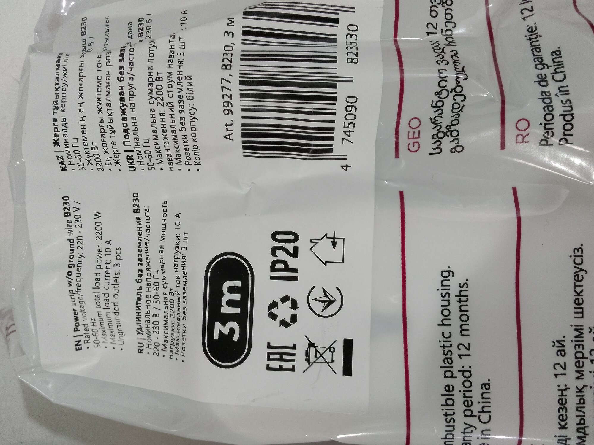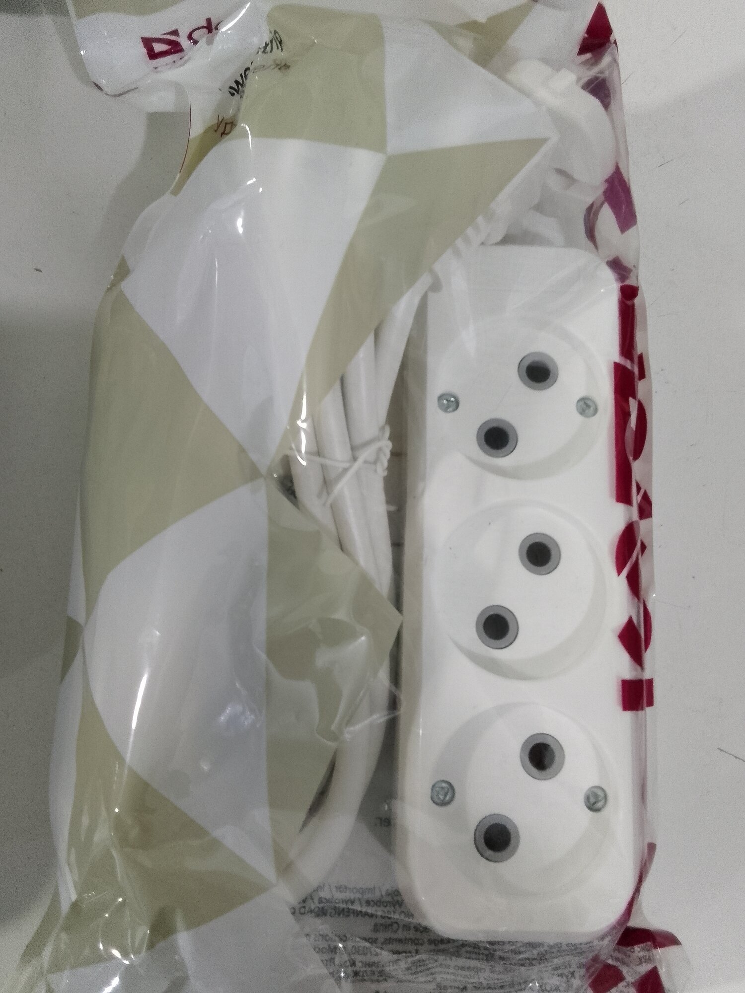 Удлинитель 3 розетки, 3м, 2*1,0 мм2, мощность 2200 Вт, ток 10А, без земли
