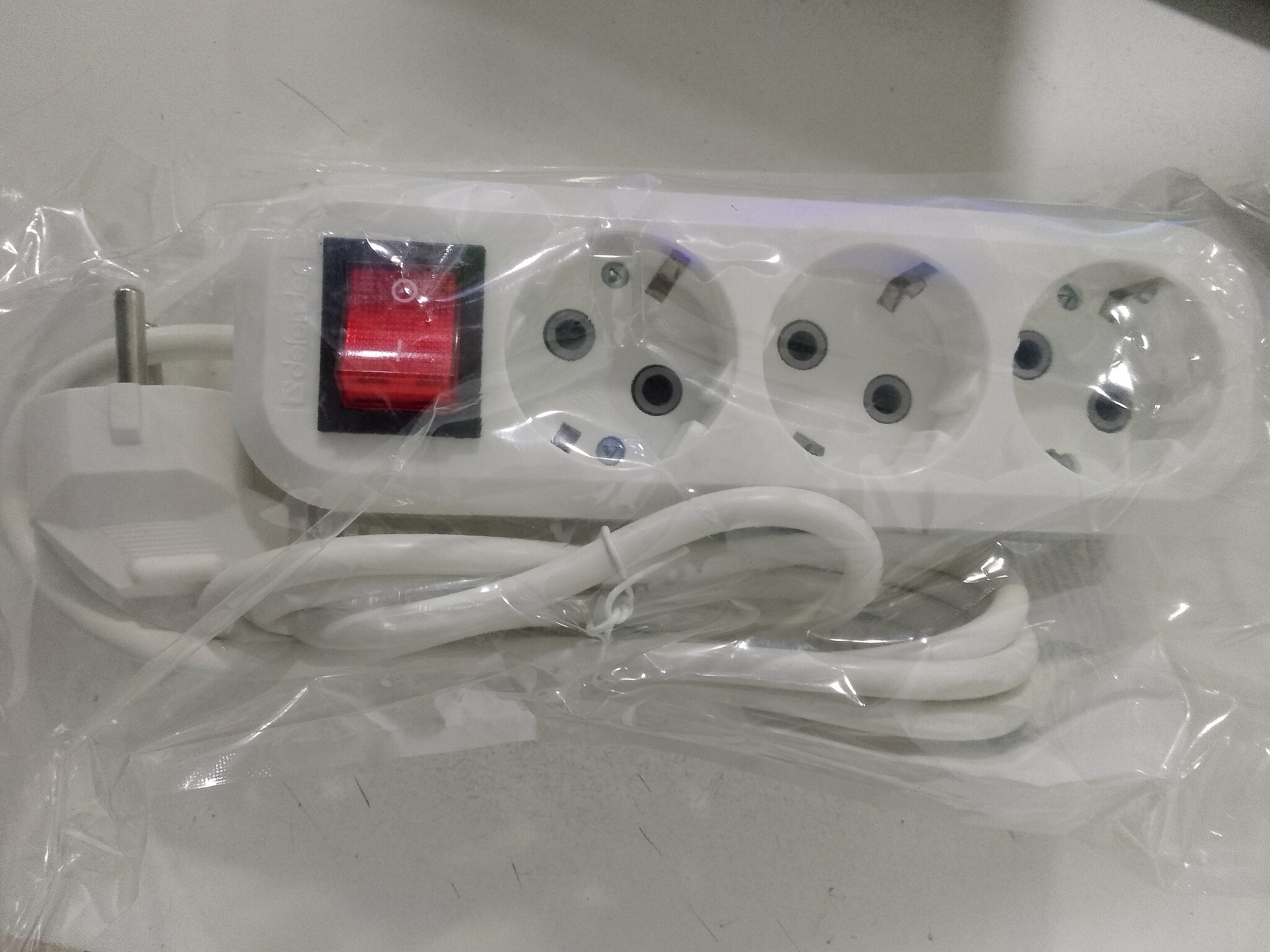 Удлинитель DEFENDER L330 3 гнезда, 1,5 метра, с заземлением, 16А/3500Вт, ПВС 3х1,0мм, с выключателем, белый