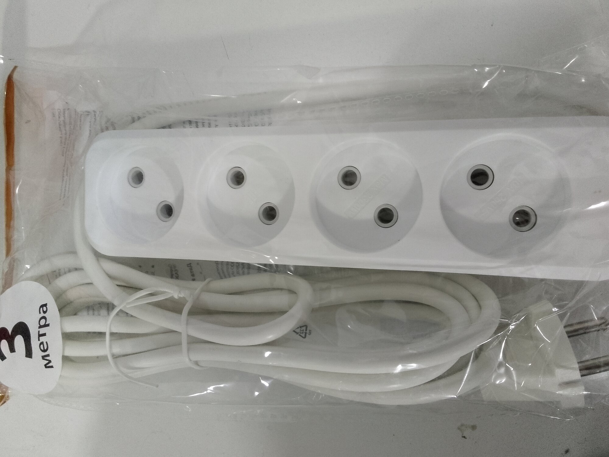 Удлинитель 4 розетки, 3м, 2*0,75 мм, мощность 2300 Вт, ток 10А, без заземления