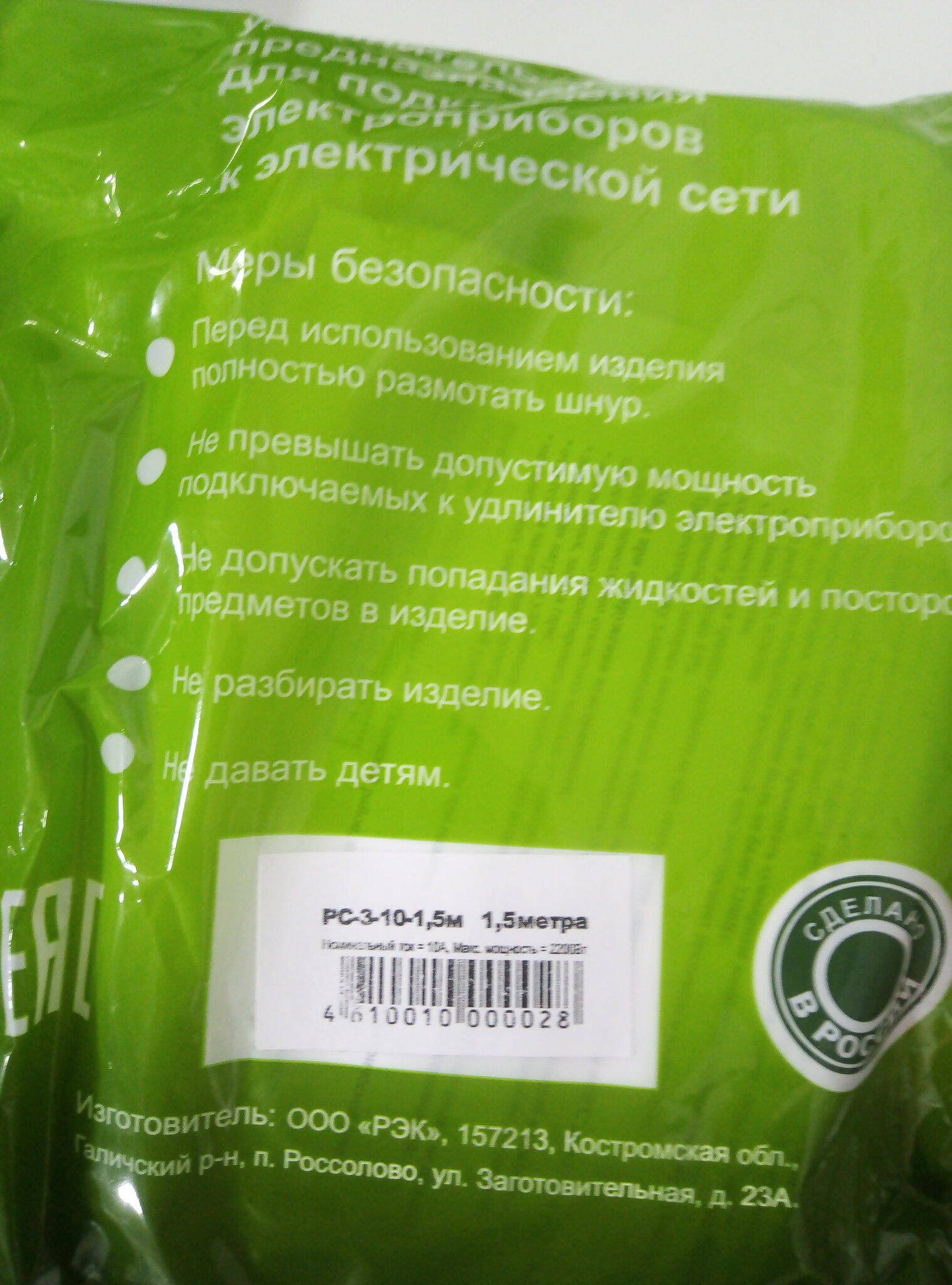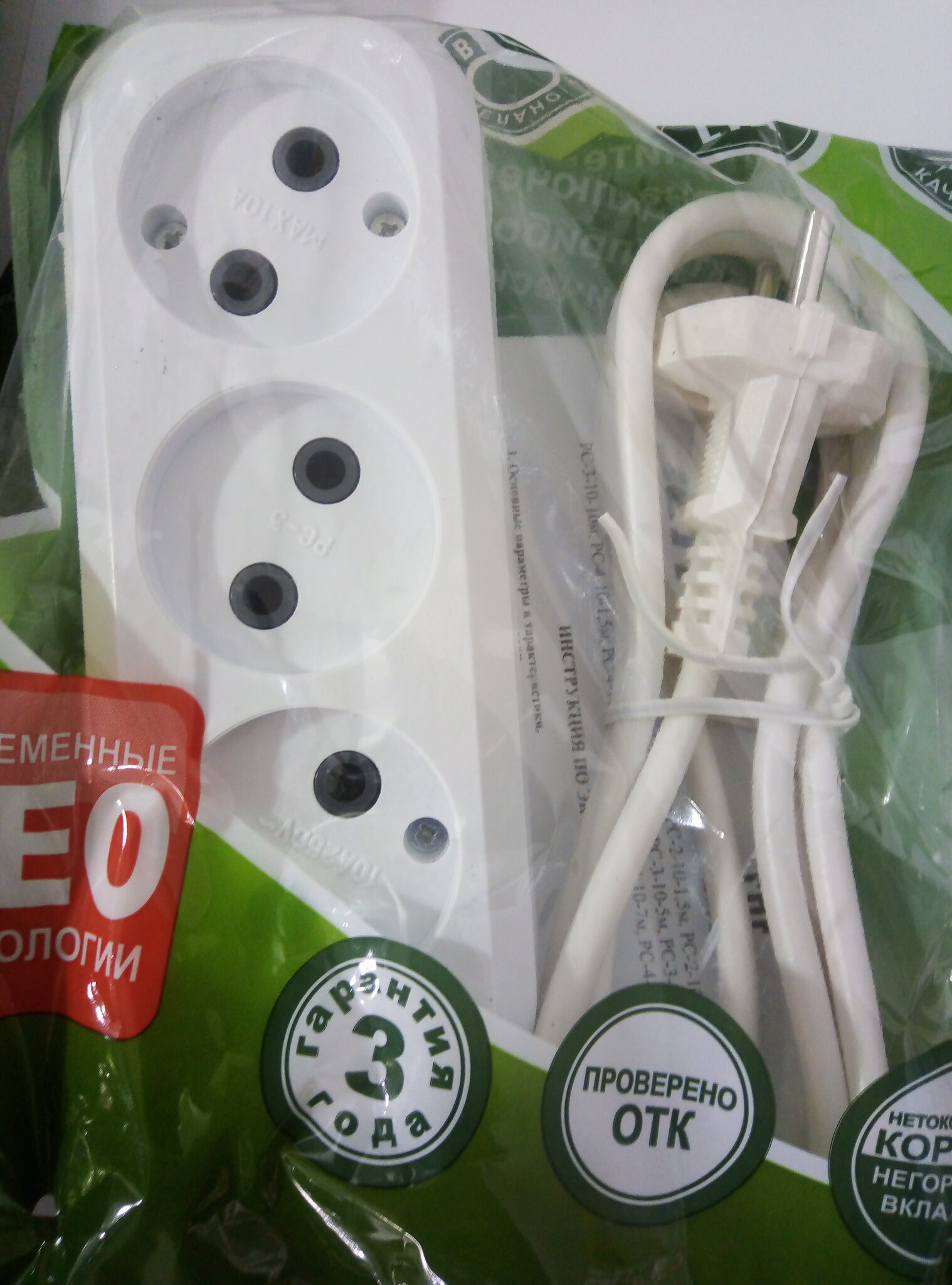 Удлинитель сетевой 3 гнезда 1.5м 10A без земли, провод ПВС 2х0,75