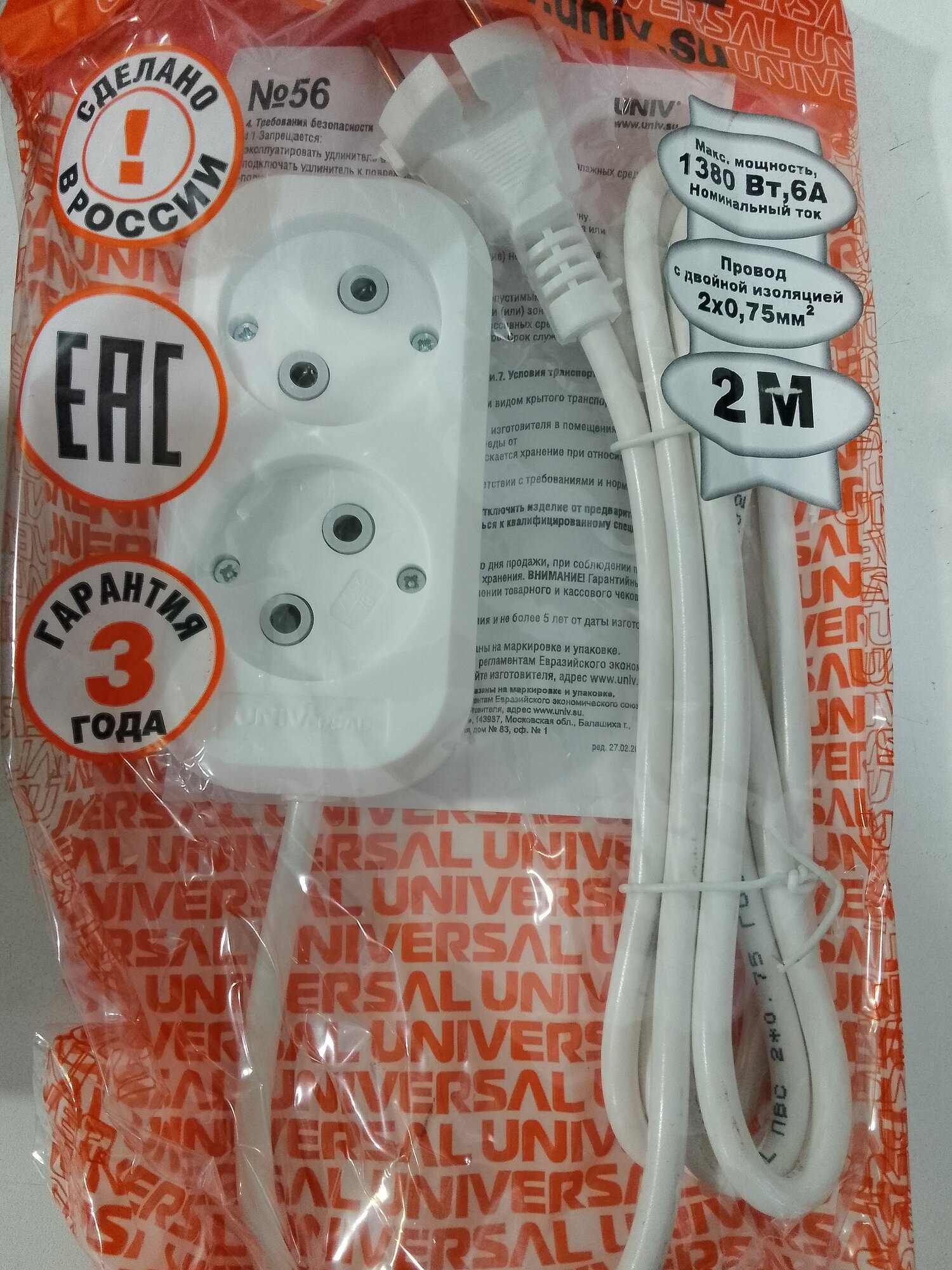 Удлинитель UNIVersal У6-011 М ПВС 2*0,75 2 гнезда без заземления, 2м (еврослот)