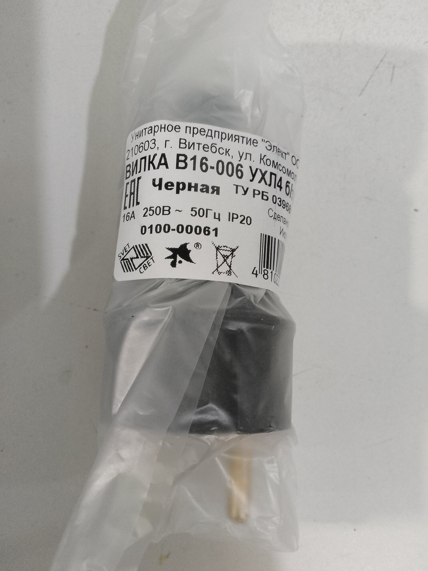 Вилка прямая каучук 2Р 1х16А 220-240V В16-006 Витебск